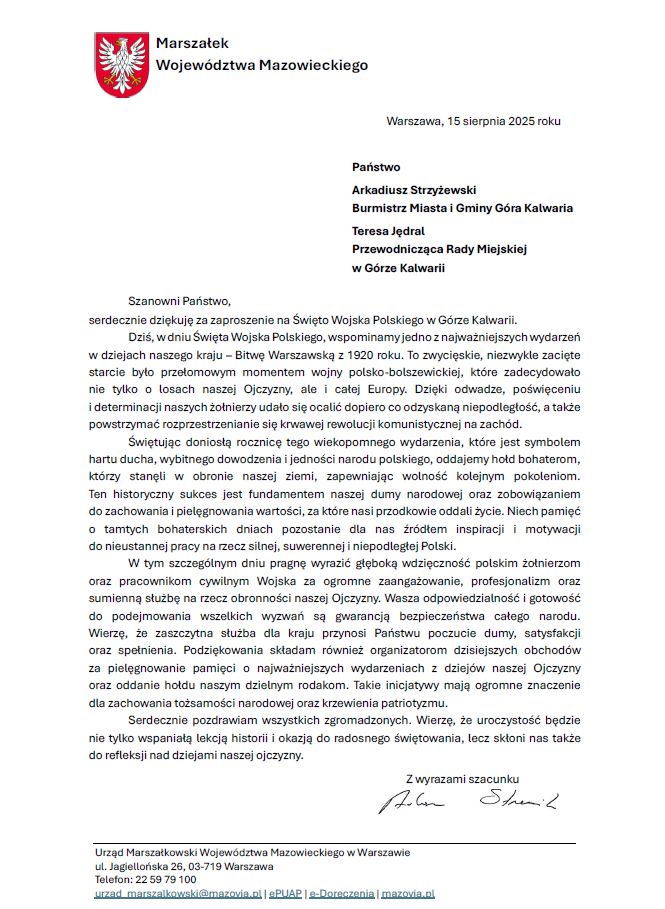 Marszałek Województwa Mazowieckiego skierował swoje słowa do uczestników uroczystości 15 sierpnia przez pomnikiem Marszałka Józefa Piłsudskiego.