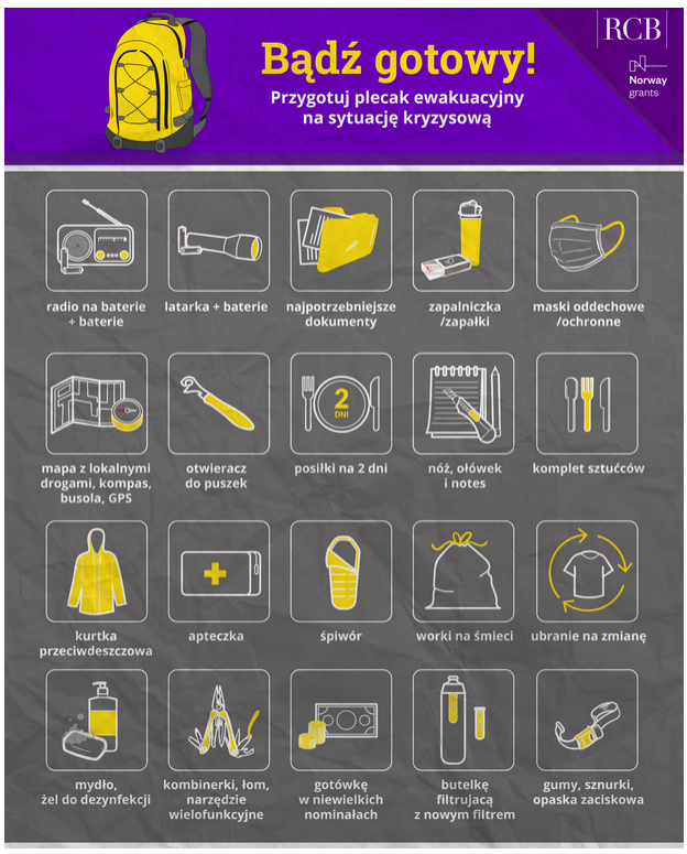Zachęcamy do zapoznania się z "Poradnikiem bezpieczeństwa". Zawiera informacje niezbędne do przygotowania się na zagrożenie i wskazówki działania w czasie kryzysu. W materiale znajdziemy m.in.: jak budować odporność na poziomie rodziny, aby zwiększyć bezpieczeństwo swoje i swoich bliskich; jak chronić się przed dezinformacją, aby nie ulec np. panice; jak się zachować podczas alarmu i co oznaczają poszczególne sygnały; jak przygotować się do ewentualnej ewakuacji; jak się zachować w przypadku skażenia terenu, braku dostaw energii elektrycznej czy sytuacji zakładniczej; jak udzielić pierwszej pomocy.