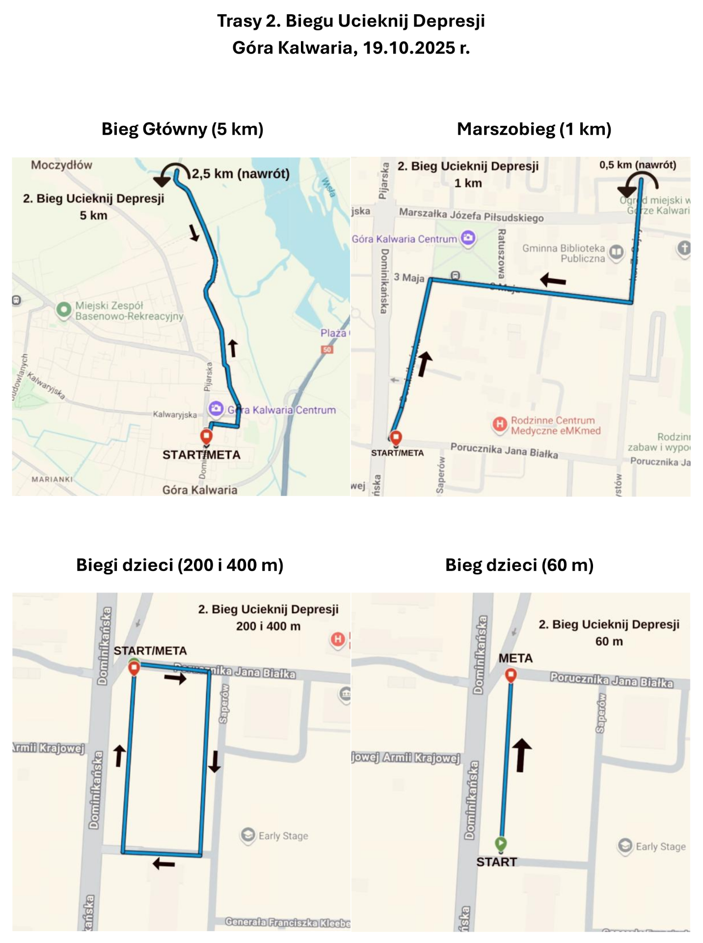 O 10.50 wystartuje marszobieg na 1 km dla rodzin i osób niepełnosprawnych. Potrwa około 10 minut. Trasę wyznaczono ulicami: krótką Dominikańską, 3 Maja i odcinkiem Sajny (będą wtedy zamknięte). Mapka – w załączeniu.
