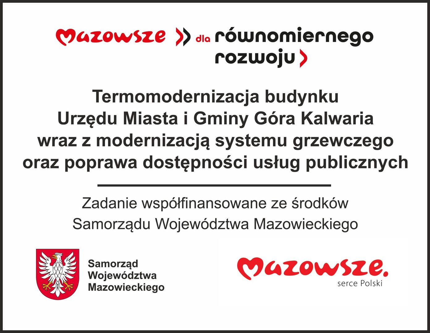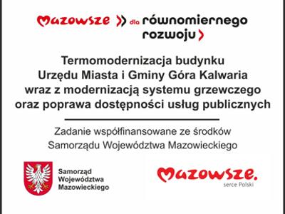 Termomodernizację budynku Urzędu Miasta i Gminy Góra Kalwaria wraz z modernizacją systemu grzewczego oraz poprawą dostępności usług publicznych współfinansowano ze środków województwa mazowieckiego.