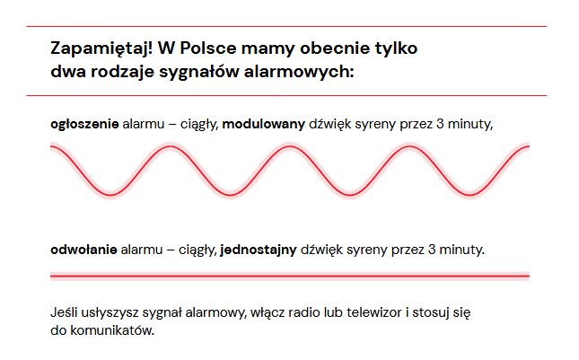 - ogłoszenie alarmu – ciągły, modulowany dźwięk syreny przez 3 minuty: https://www.youtube.com/watch?v=_4FCnIoffhw