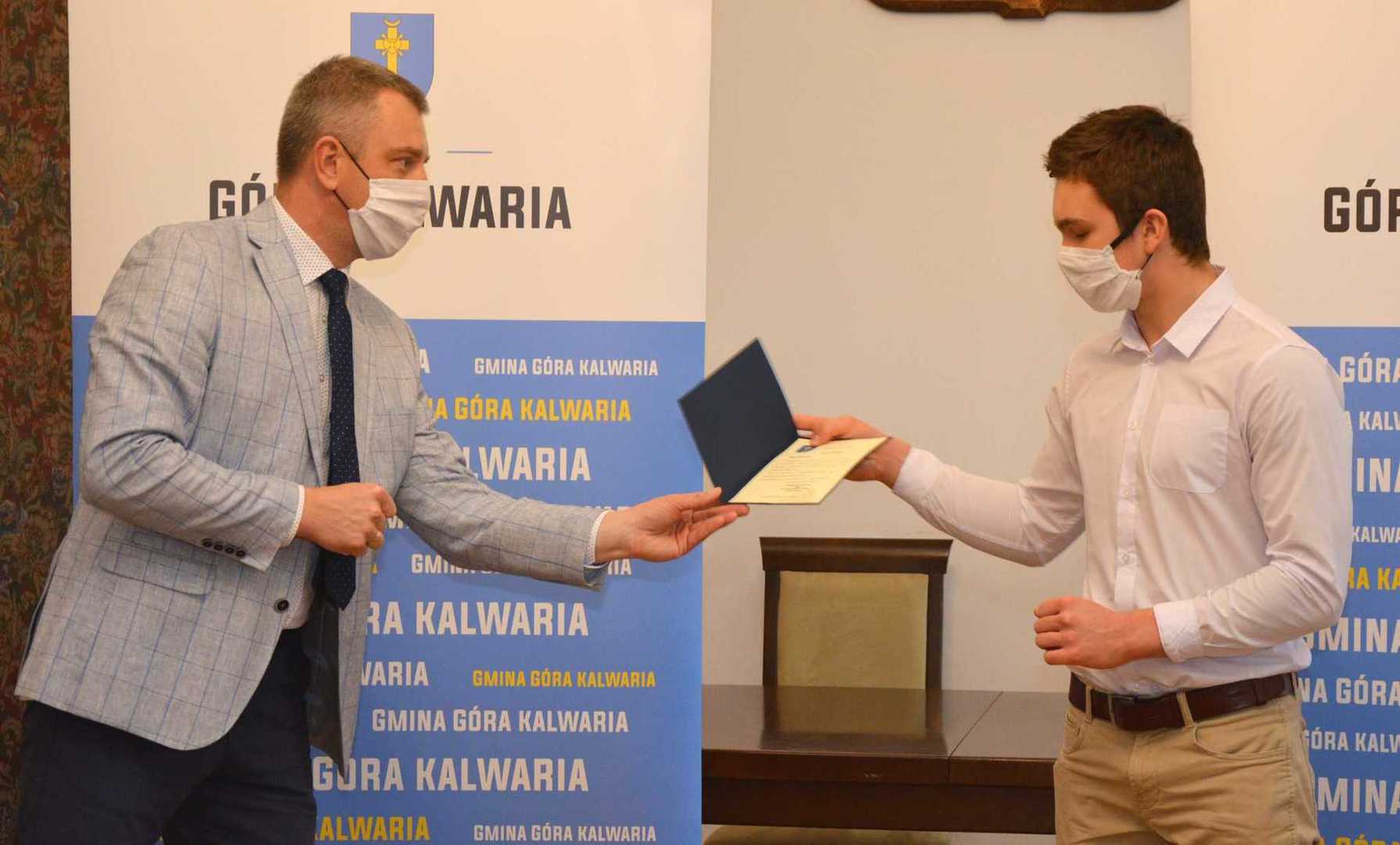 Stan epidemii sprawił, że tegoroczna gala stypendialna została odwołana. Dziś Burmistrz Arkadiusz Strzyżewski wręczył w ratuszu dyplomy uznania wąskiemu gronu stypendystów, którzy w minionym roku szkolnym dokonali nadzwyczajnych osiągnięć. Byli to: Anna Aksamit ze Szkoły Podstawowej nr 2 w Górze Kalwarii (wysokie wyniki w nauce); Zuzanna Chołuj z Liceum Ogólnokształcącego w Górze Kalwarii (wysokie wyniki w nauce, medalistka festiwali tanecznych); Kacper Dubiniak ze Szkoły Podstawowej w Cendrowicach (medalista zawodów pływackich) Marta Kasprzyk ze Szkoły Podstawowej w Czersku (wysokie wyniki w nauce, medalistka zawodów biegowych oraz laureatka konkursu plastyczno-literackiego) oraz Weronika Kołodziej z Zespołu Szkolno-Przedszkolnego w Kątach (wysokie wyniki w nauce).