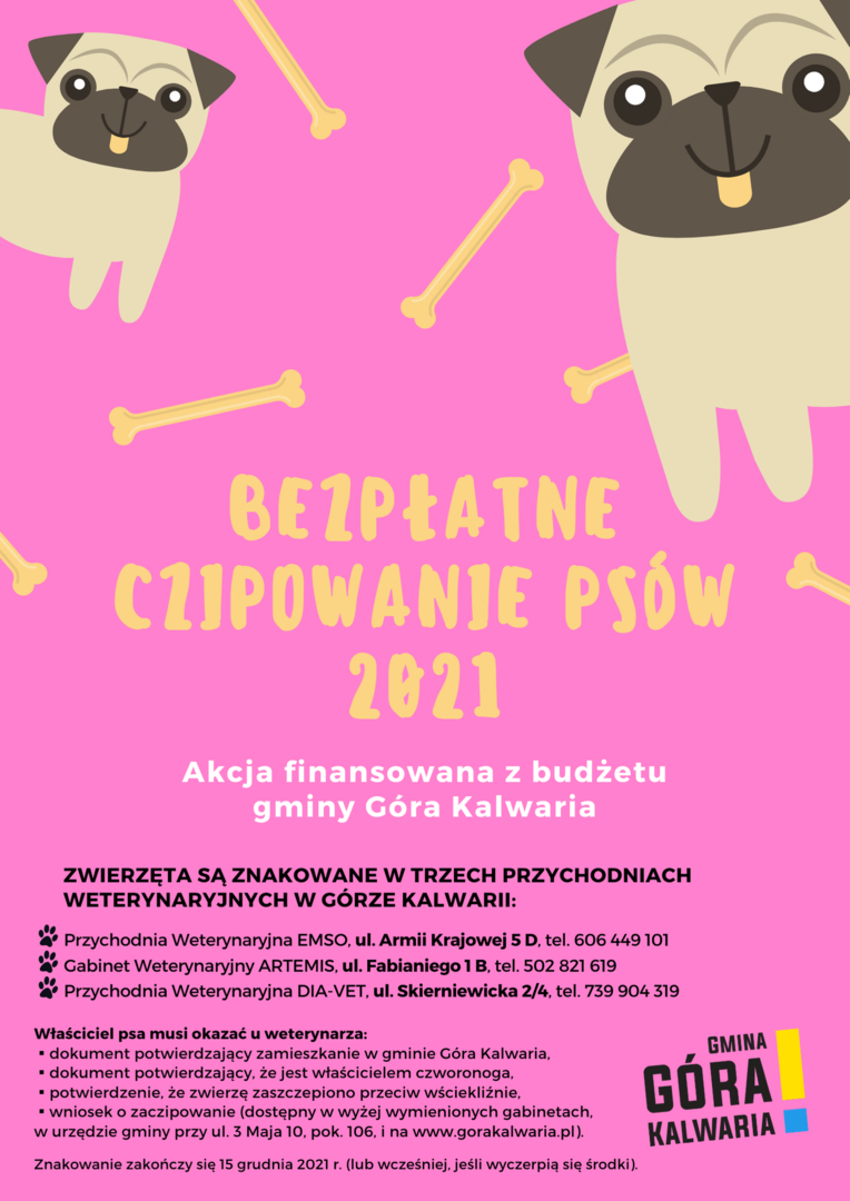 Od 2018 roku samorząd Góry Kalwarii finansuje czipowanie psów należących do mieszkańców gminy. Właściciele za zabieg nie płacą. Pupilowi wszczepiany jest przez weterynarza mikroczip – elektroniczny identyfikator. Zawiera on kod, który również weterynarz rejestruje w międzynarodowej bazie danych. Dzięki temu kiedy zwierzak się błąka, można sprawdzić, kto jest jego właścicielem (może to zrobić, za pomocą czytnika, strażnik miejski lub weterynarz). W latach 2018–2020 za fundusze z gminnego budżetu oznakowano 1158 psów.