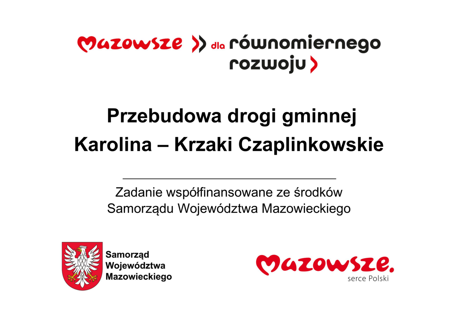Zadanie pn. Przebudowa drogi gminnej Karolina – Krzaki Czaplinkowskie jest współfinansowane ze środków Województwa Mazowieckiego.